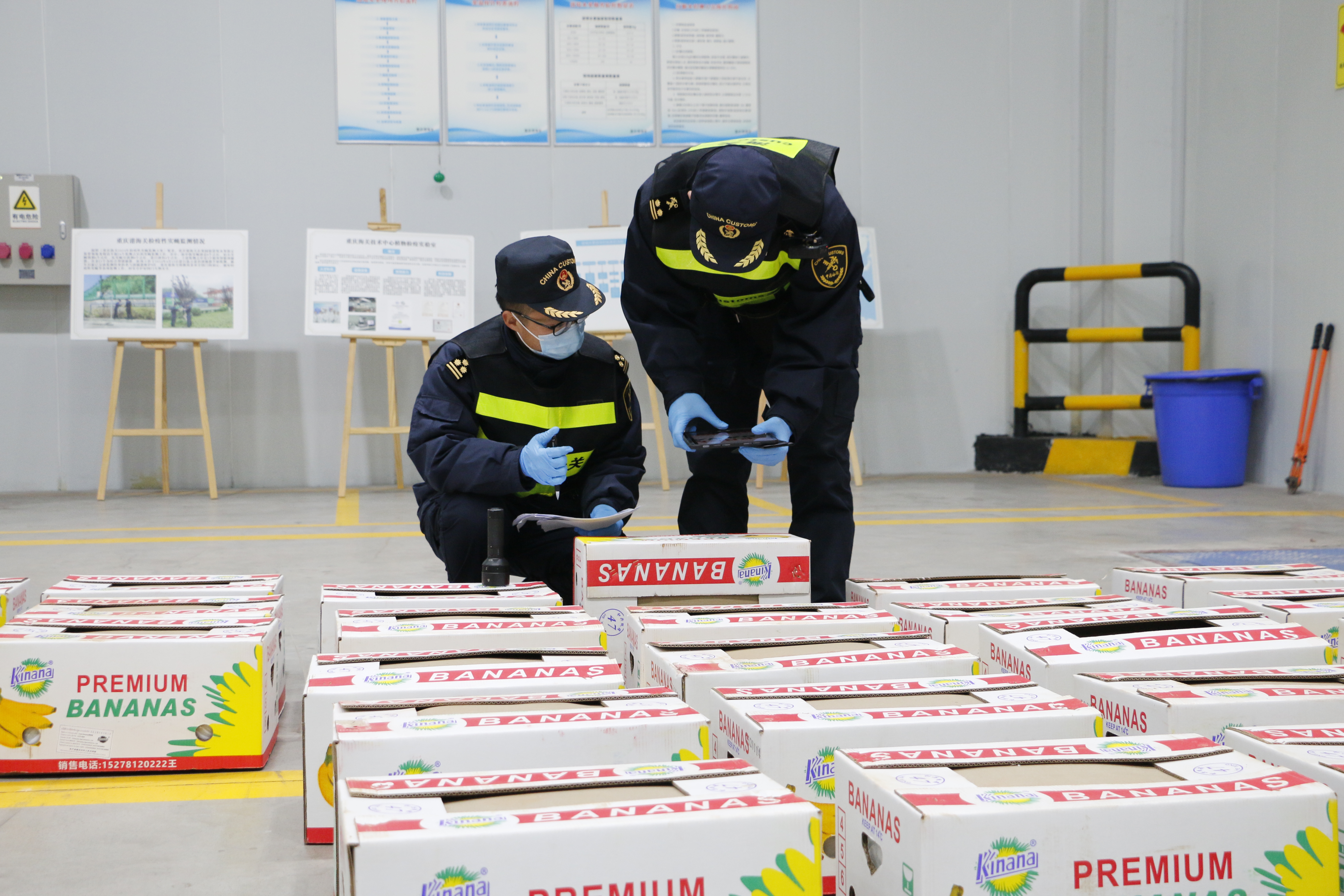 ▲1月24日,重庆港海关关员在对进口香蕉进行现场查验。受访单位供图