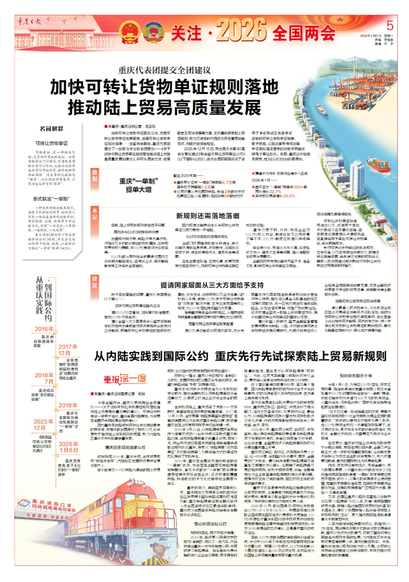 加快可转让货物单证国内立法、完善可转让货物单证政策配套、加强可转让货物单证司法保障……全国两会期间,重庆代表团提交了一份极为专业的全团建议——《关于加快可转让货物单证规则落地推动陆上贸易高质量发展的建议》,呼吁从国家立法、政策配套及司法保障等方面,支持重庆探索陆上贸易规则,助力打造新时代西部大开发重要战略支点、内陆开放综合枢纽。