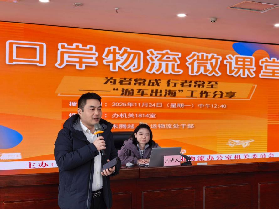 2025年11月24日,由市政府口岸物流办政策法规处和水运物流处党支部承办的“口岸物流微讲堂”2025年第十讲,在办机关1814多功能会议室举行,来自各处室、中心的负责人及30余名干部职工参加学习。水运物流处一级主任科员朱腾越以“渝车出海”保运保畅工作整体框架搭建、细节切口深入为脉络,通过对长安、长城、赛力斯等主要重庆造汽车主机厂物流服务实例的讲解分析,分享了“渝车出海”保运保畅规划、执行、推进的相关工作经验,受到大家的一致好评。